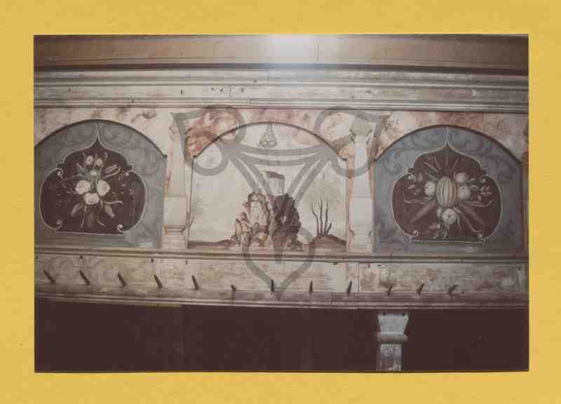Rahmenkonstruktion; Füllungen, Rahmen und Gelände bemalt. Auf dem unteren Rahmenfries neben floralen Motiven Schriftzeichen, darüber auf den Rahmen hölzerne Pliaster, ebenfalls bemalt, darüber Handlauf. Zwei Füllungen mit floralen Motiven (linker und rechter Bildrand), in der mittleren Füllung eine Kirche auf einem Felsen, darüber schwebend der Heilige Geist(?). Unter dem Fries ein längerer Kleiderhaken.