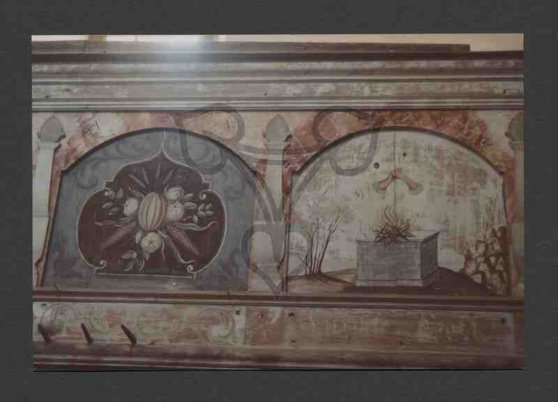 Rahmenkonstruktion; Füllungen, Rahmen und Gelände bemalt. Unten links hölzerne Kleiderhaken, auf den Rahmen hölzerne Pilaster, ebenfalls bemalt, oben Handlauf. Linke Füllungen mit floralen Motiven rechte Füllung die Darstellung eines Brandopferaltars, darüber schwebend zwei gefaltete Hände.