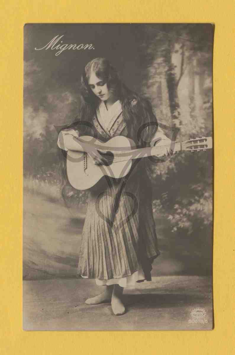 Bildpostkarte zu Goethes „Wilhelm Meisters Lehrjahre, Mignon und der Harfner“. Studioaufnahme, gemalter Hintergrund. Eine Frau in wallenden Kleid und mit offenem langem Haar spielt auf einer Gitarre. In der linken unteren Ecke das nicht entzifferbare Signet des Fotostudios.