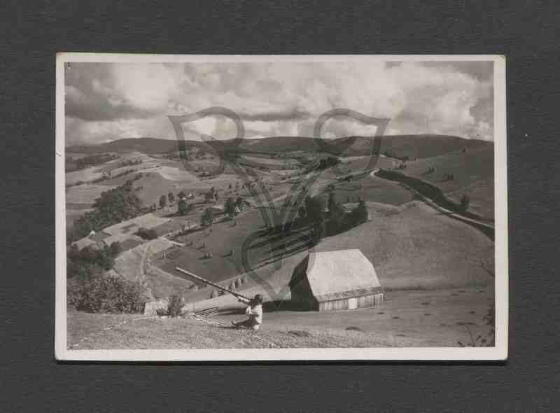 Zu sehen ist die weitläufige, spärlich bewaldete sanfte Hügellandschaft der siebenbürgischen Westkarpaten, am unteren Bildrand links eine Person, die ein Bucium spielt, rechts von ihr eine Holzhütte, am oberen Bildrand bewölkter Himmel.