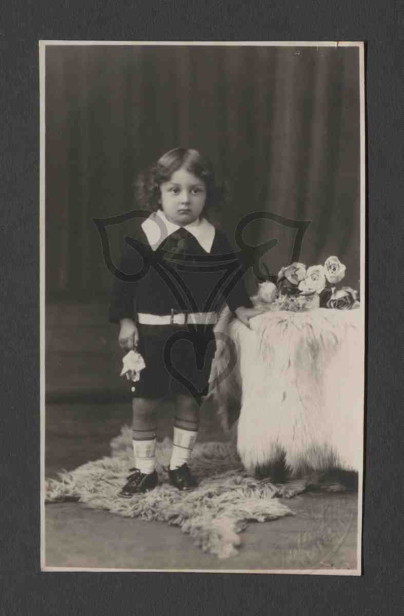 Studioaufnahme, gemalter Hintergrund, Tisch, Felle und Blumen Requisiten. Der Junge trägt einen schwarzen Hosenanzug mit weißem Hemd, überdimensionierter bunter Krawatte, weißen Socken und schwarzen Schuhen. Er steht auf einem am Boden liegenden Fell aufrecht da, hält in der rechten Hand eine helle Rose, stützt sich mit der linken Hand an der Kante eines Kindertisches(?) ab und blickt rechts an der Kamera vorbei. Der Tisch ist mit einem Fell vollständig bedeckt, auf der Platte liegt ein Strauß Rosen. Aus der rückseitigen Beschriftung geht hervor, dass der Junge im Alter von 2 Jahren und 10 Monaten abgebildet wurde. In der rechten unteren Ecke der Prägestempel des Fotografen.