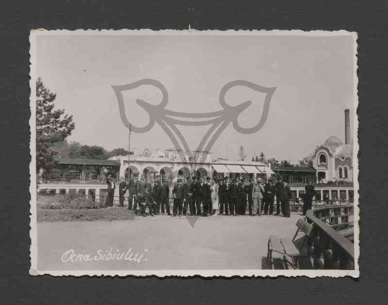 Reisegruppe, teils aus uniformierten Schülern bestehend, aus Caracal in Karlsburg. Die Gruppe posiert stehend vor der Kuranlage mit den künstlichen Teichen.