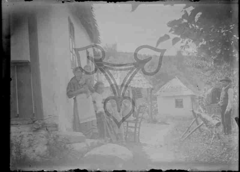 Ansicht eines Innenhofes. In Reihe nebeneinander sind drei bewohnte Häuschen abgebildet. An der Außenwand des vordersten Hauses ganz links sitzen bzw. stehen um einen Tisch gruppiert mehrere Frauen und Kinder in rumänischer Alltagstracht. Am rechten Bildrand steht ein Mann in schwarzer Hose, schwarzer Weste, weißem Hemd und schwarzem Hut.