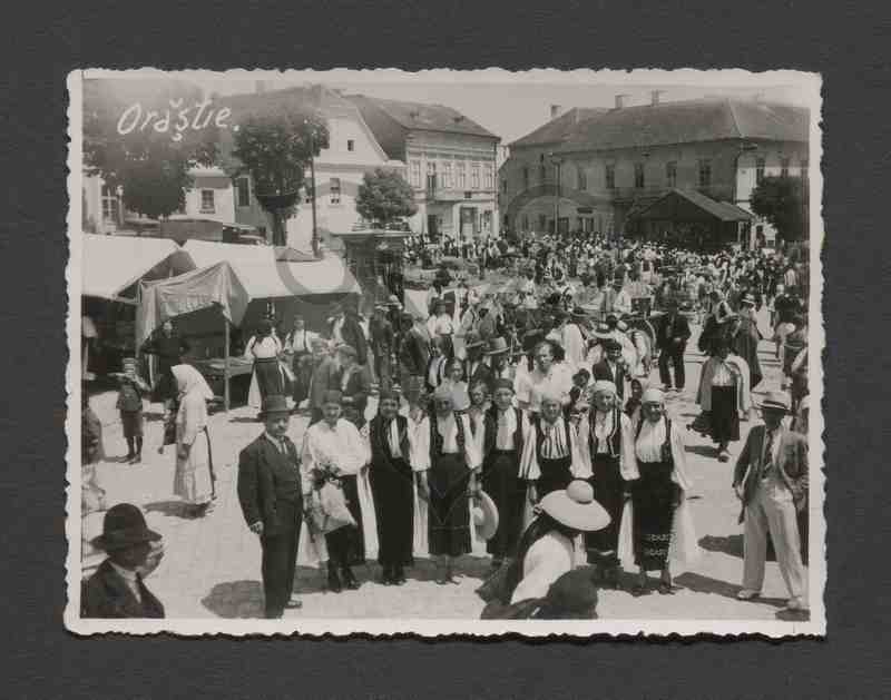 Eine Gruppe Tracht tragender Frauen aus Caracal posiert auf dem Brooser Marktplatz vor lebhaftem Markttreiben.