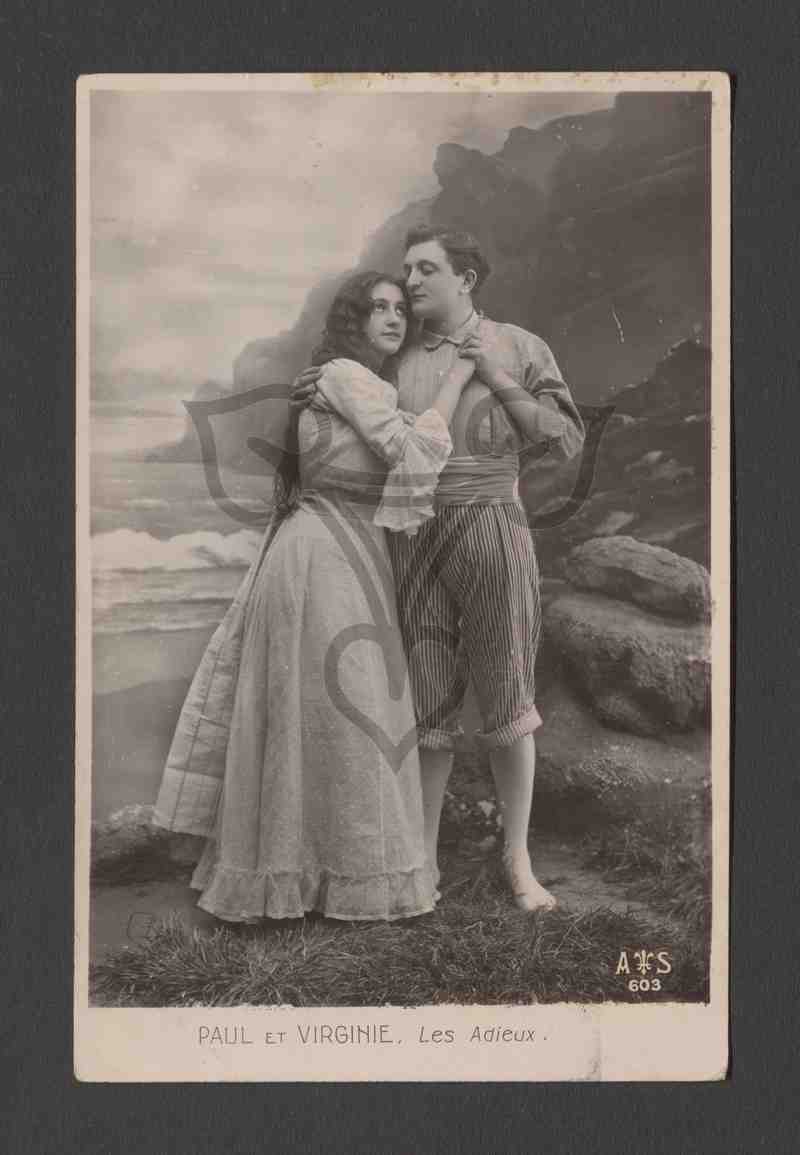 Studioaufnahme, gemalter Hintergrund. Eng umschlungenes Paar vor Küstenhintergrund. In der rechten unteren Ecke das Signet des Verlages: A & S 603.
