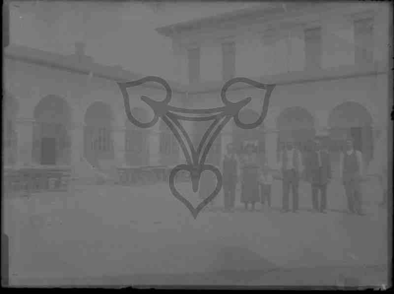 Das Bild zeigt eine Gruppe von Personen, die in einem Innenhof vor einem nicht näher bestimmbaren Gebäude mit Arkaden posieren.
