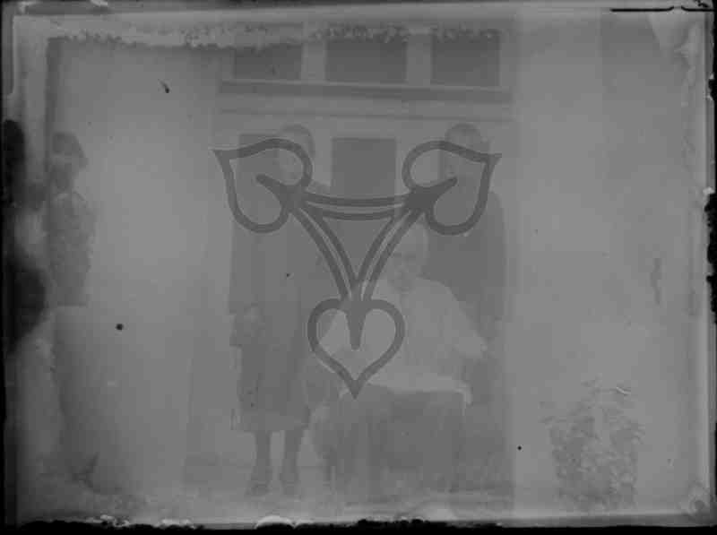 Vor einem Gebäude befinden sich drei Personen. Ganz links steht eine Frau, rechts neben ihr ein junger Mann in Soldatenuniform. Beide stehen. Zwischen den Beiden sitzt ein älterer Mann in einem Sessel. Er trägt ein weißes Hemd und schwarze Hose. Die Frau ist in einen Rock und einen Mantel gekleidet, bei lang, weit und dunkel.