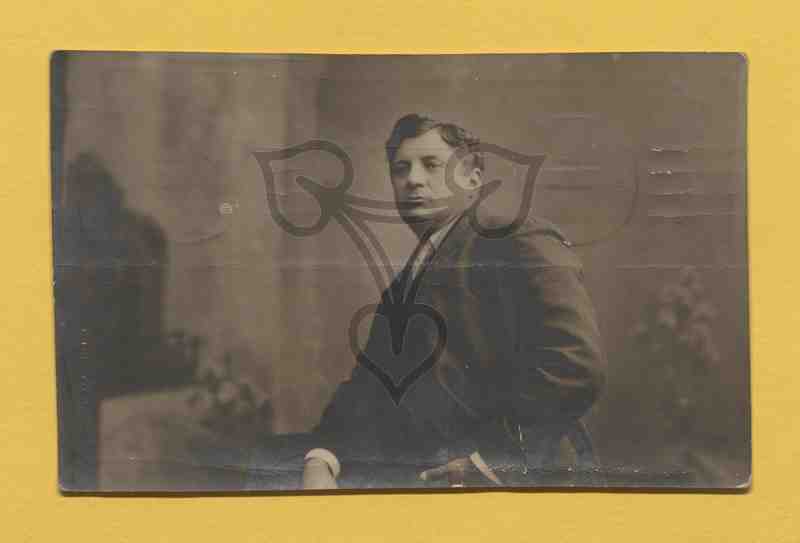 Studioaufnahme, gemalter Hintergrund. Der rumänische Schauspieler trägt einen schwarzen Anzug mit weißem Hemd und bunter Krawatte, sitzt auf einer nicht näher erkennbaren Oberfläche, ist nach links gewandt und blickt an der Kamera vorbei.