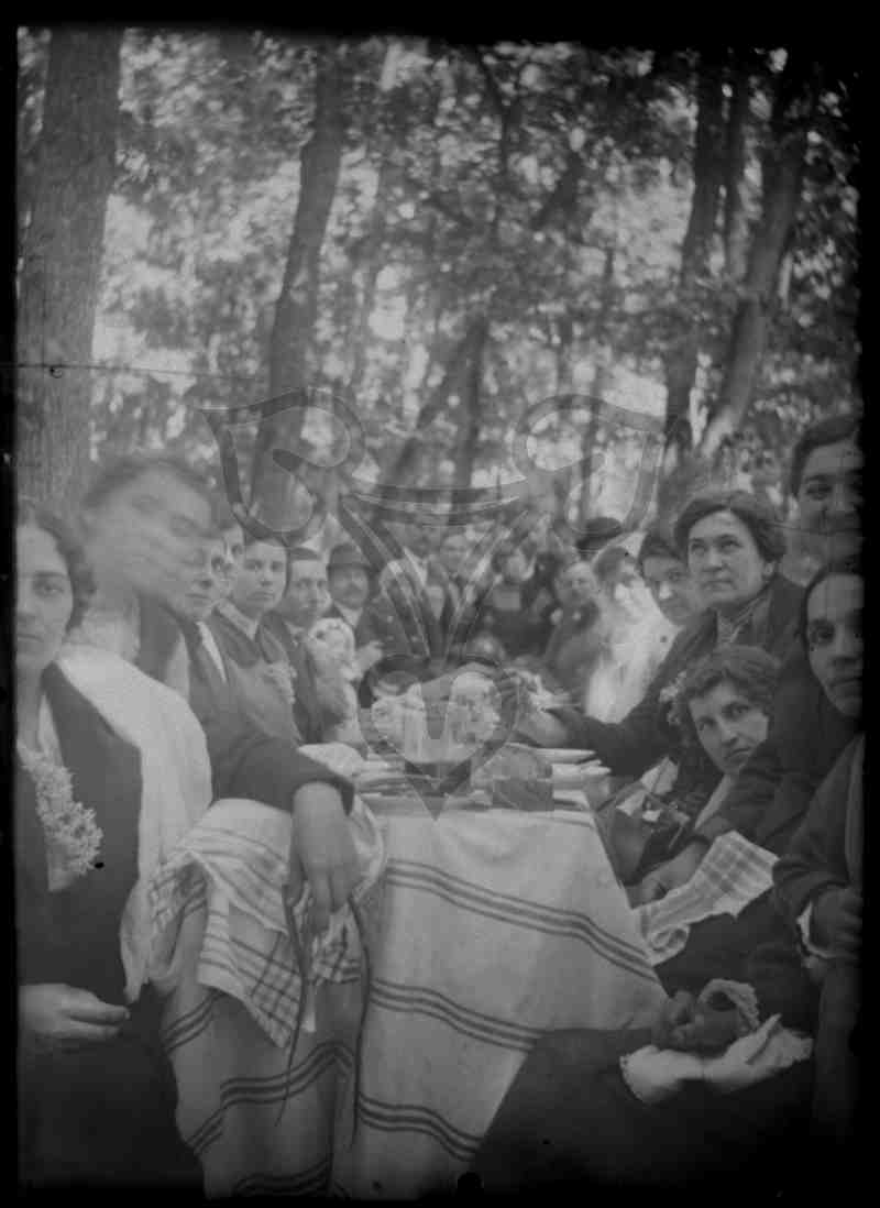 Festtafel im Freien unter Bäumen. Links und rechts des reich gedeckten Tisches sitzende, teils in die Kamera blickende Personen.