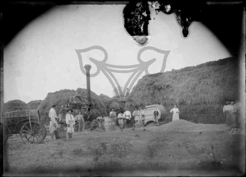 Vor einigen riesigen Strohhaufen steht eine dampfbetriebene Dreschmaschine. Um diese verteilt sind mehrere rumänischen Bauern abgebildet. Vgl. auch PB 207/189.