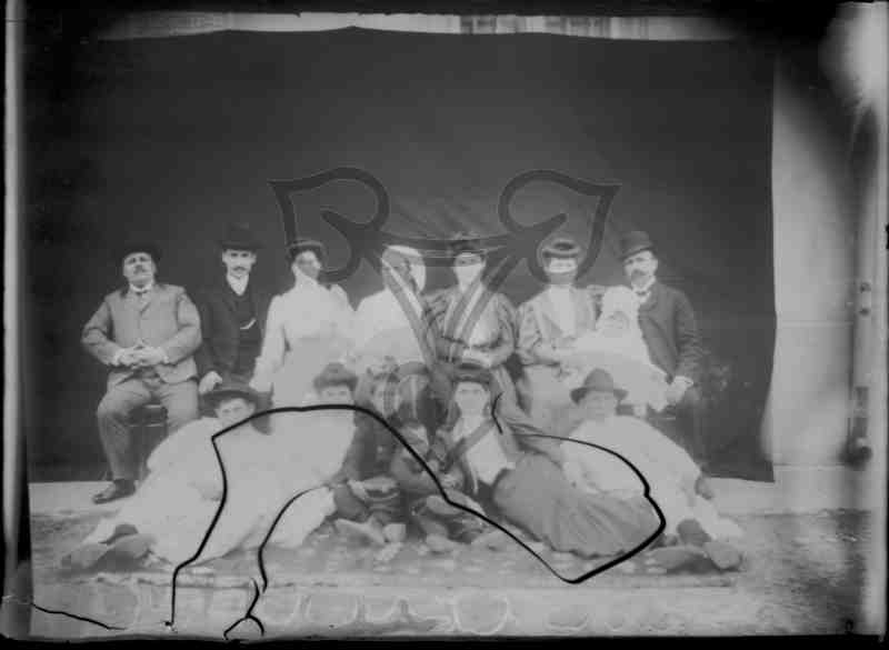 Vor einem aufgespannten schwarzen Tuch sind in zwei Reihen mehrere Personen beiderlei Geschlechts und unterschiedlichsten Alters abgebildet. Die hintere Reihe sitzt auf Stühlen, die vordere liegt auf einem ausgebreiteten Teppich. Alle blicken in die Kamera.