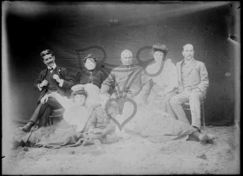 Vor einem aufgespannten dunklen Tuch ist eine Personengruppe beiderlei Geschlechts und unterschiedlichsten Alters abgebildet. Die hintere Reihe, zwei Frauen, drei Männer, sitzen auf Stühlen, die vordere Reihe, zwei erwachsene Frauen, ein Junge, sitzen auf dem Boden.