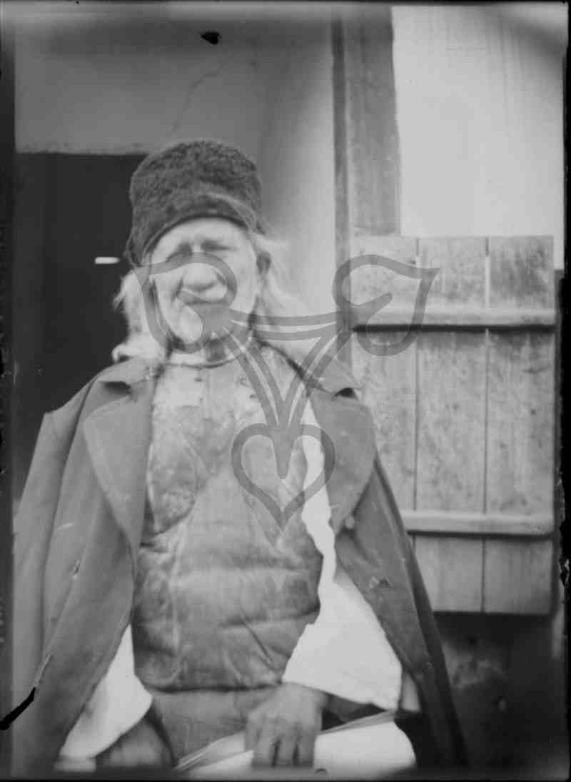Abgebildet ist ein Arbeitstracht tragender älterer Mann mit langen weißen Haaren und Vollbart. Im Hintergrund ein Gebäude mit weiß getünchten Wänden.