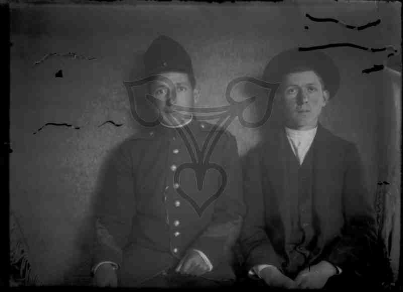 Drei nebeneinander sitzende junge Männer, der linke trägt Uniform, der rechte einen dunklen Anzug.