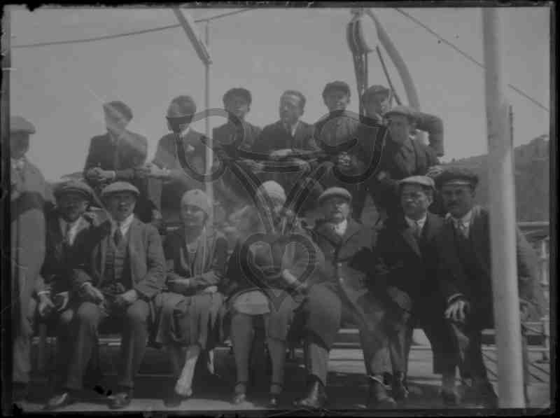 Eine Gruppe Männer und Frauen sitzen in zwei Reihen hintereinander auf einer Bank und der Reling eines Flussdampfers. Fast ausnahmslos sind sie alle in dunkle Anzüge und Kleider gekleidet, die meisten blicken in die Kamera.