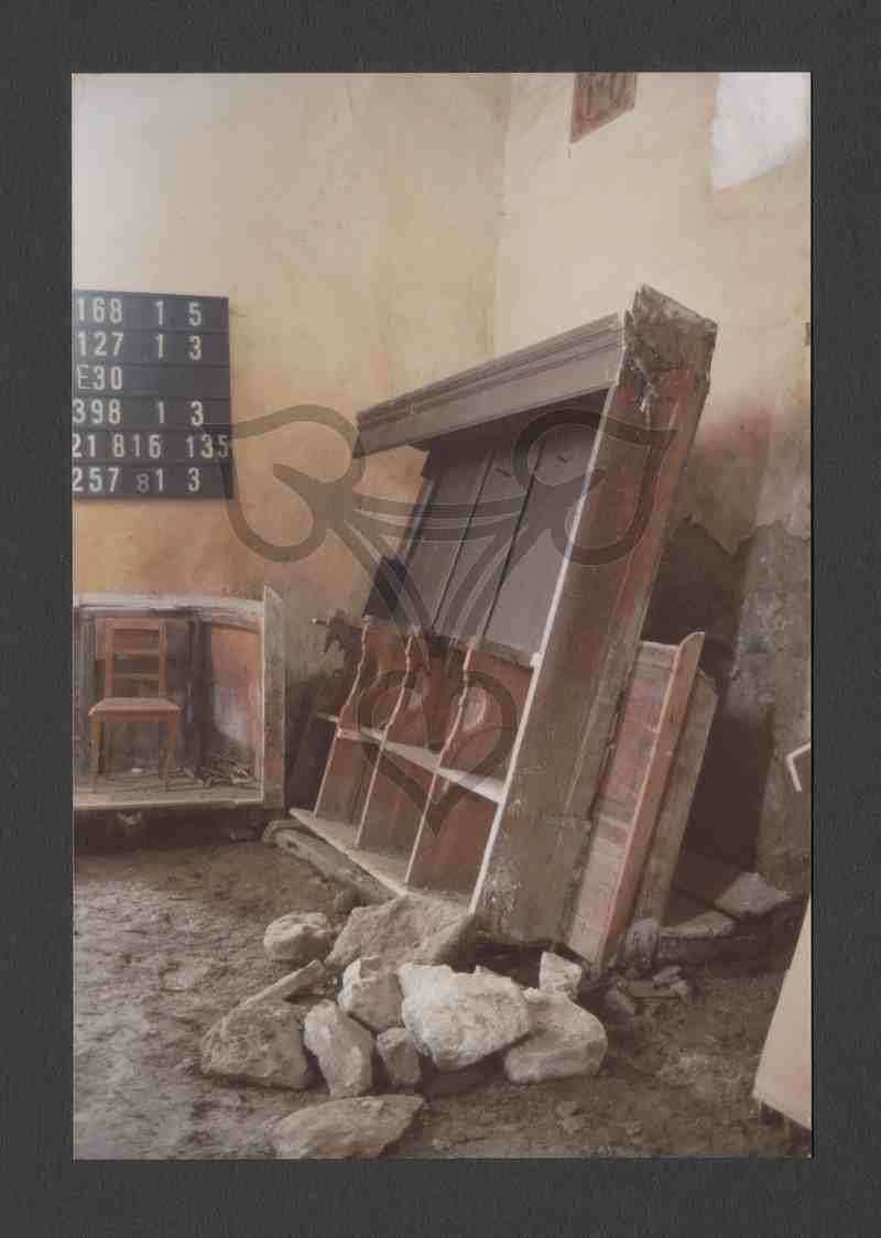 Blick von West nach Ost in den Innenraum der Repser evangelischen Kirche mit Schwerpunkt auf die südöstliche Ecke. Bilddominierend zerlegtes Chorgestühl, davor Steinbrocken. Am linken Bildrand weitere Chorgestühlteile, ein Stuhl sowie eine Liedtafel.