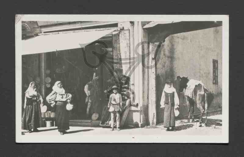 Mehrere Personen vor einem Krämerladen, dessen Eingang von einer Markise beschattet wird. Rechts neben dem Gebäude ein geschnitzter, hölzernen Torbogen.