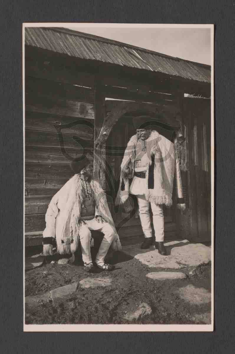 Zwei Tracht tragende Männer vor einem geschnitzten Hölzernen Tor mit Torbogen.