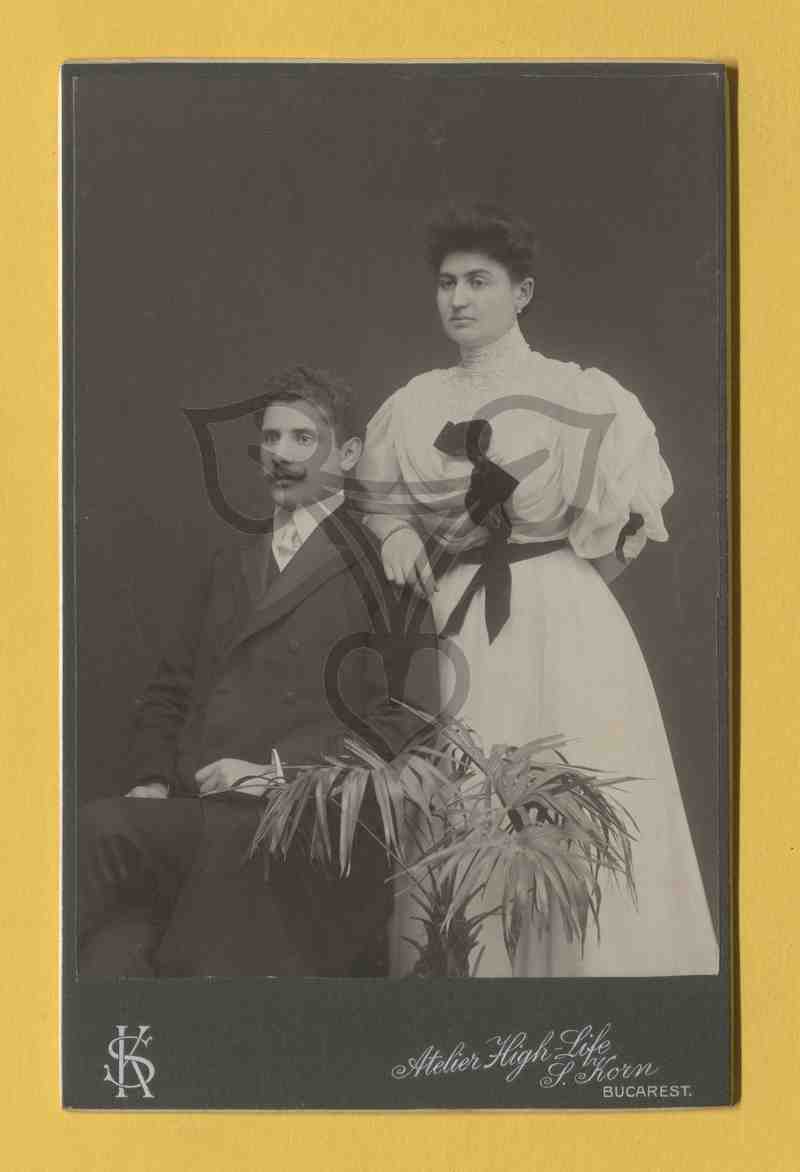 Studioaufnahme, neutraler Hintergrund. Der schwarz gekleidete Mann sitzt auf einem Stuhl, die weiß gekleidete Frau steht rechts von diesem und stützt sich mit ihrem rechten Unterarm auf der Rückenlehne des Stuhles ab. Beide sind nach links gewandt und blicken an der Kamera vorbei. Vor ihnen steht eine palmenartige Zimmerpflanze.