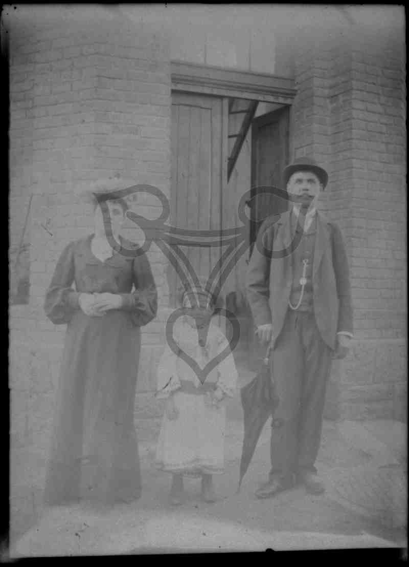 Vor einem Backsteingebäude steht ein Paar. Links die Mutter in einem dunklen Mantel und hellem Hut, rechts der Vater in dunklem Anzug, mit weißem Hemd und Krawatte und dunklem Hut. Er stützt sich auf einen Regenschirm. Zwischen den beiden steht ein Kind.