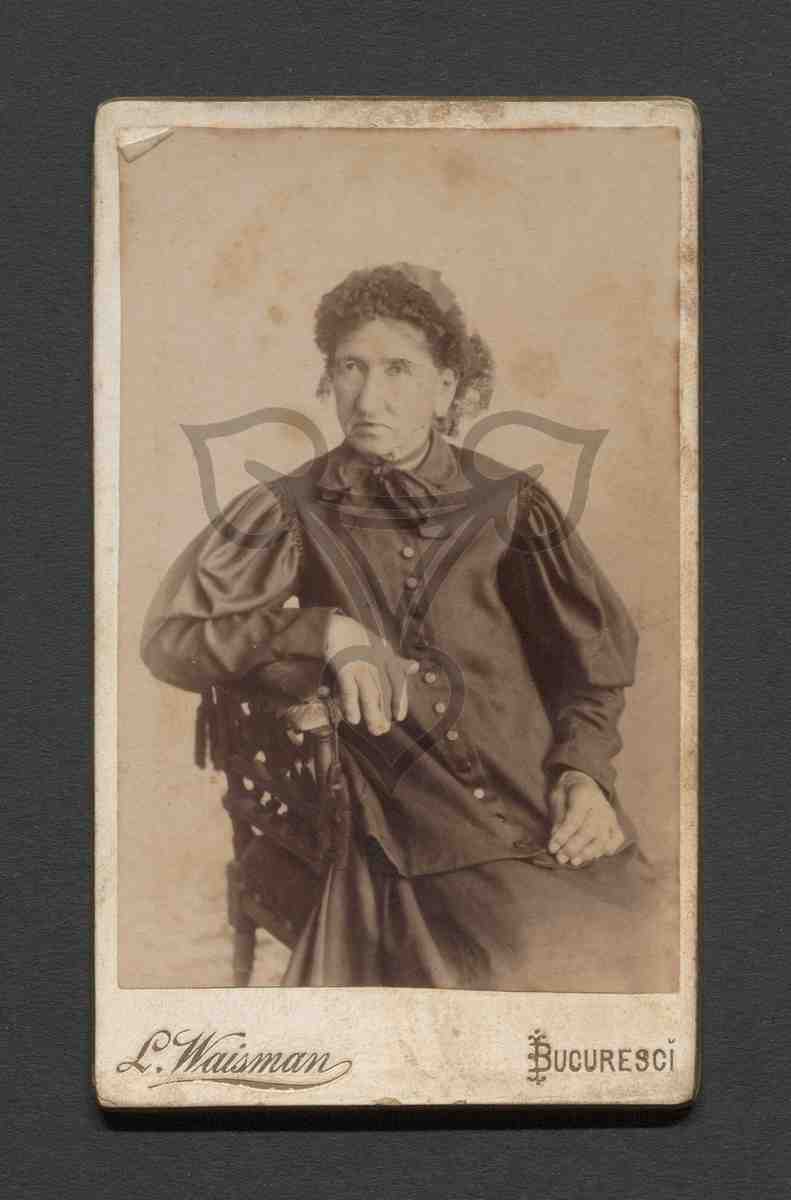 Studioaufnahme, neutraler Hintergrund. Die Frau sitzt auf einem Stuhl nach rechts gewandt, trägt einen schwarzen Rock, eine schwarze Bluse, eine schwarze Haube und blickt links an der Kamera vorbei.