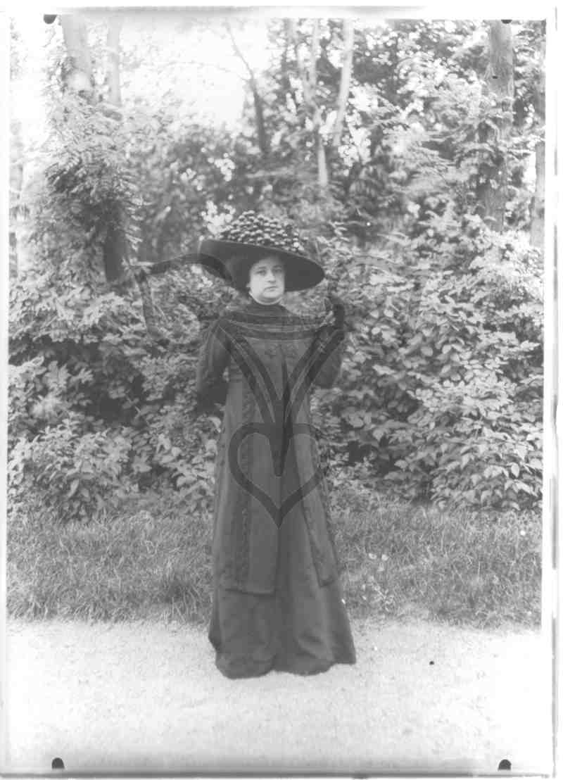 In einer Park- oder Gartenanlage steht eine in schwarzer vornehmer Kleidung gekleidete Frau und blickt in die Kamera. Sowohl das bodenlange Kleid als auch die darüber getragene Weste sind reich bestickt. Auf dem Hut befindet sich ein üppiger Blumenschmuck. Sie trägt schwarze Handschuhe und hat einen Sonnenschirm(?) unter den linken Arm geklemmt.