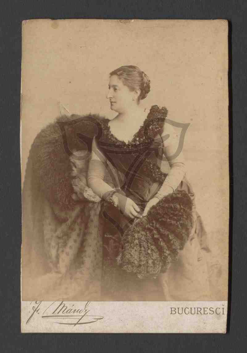 Studioaufnahme, neutraler Hintergrund. Die aufrecht stehende Frau im Abendkleid blickt nach links.