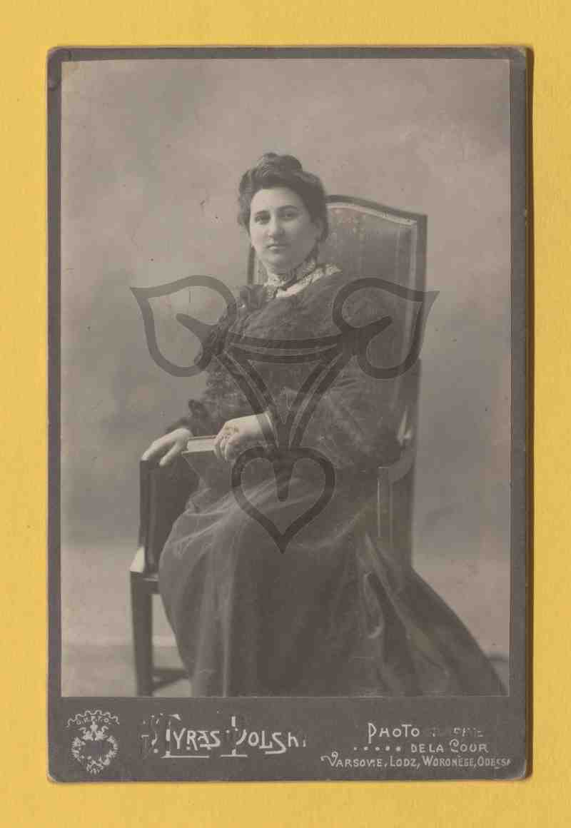 Studioaufnahme, neutraler Hintergrund. Die schwarz gekleidete Frau sitzt nach links gewandt auf einem Stuhl mit hoher Rückenlehne, hält ein Buch in der linken Hand und blickt in die Kamera.