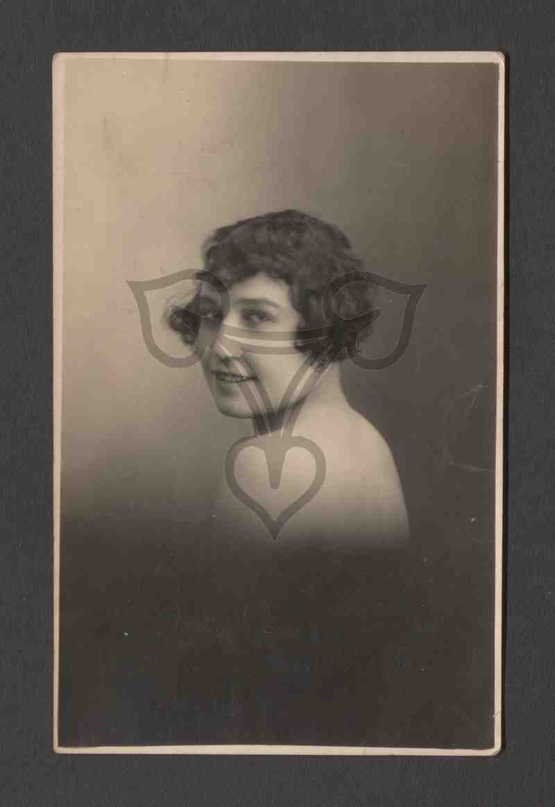 Studioaufnahme, neutraler Hintergrund. Halbbrustporträt einer jungen Frau mit nackten Oberkörper. Sie dreht der Kamera den Rücken zu und blickt in die Kamera.