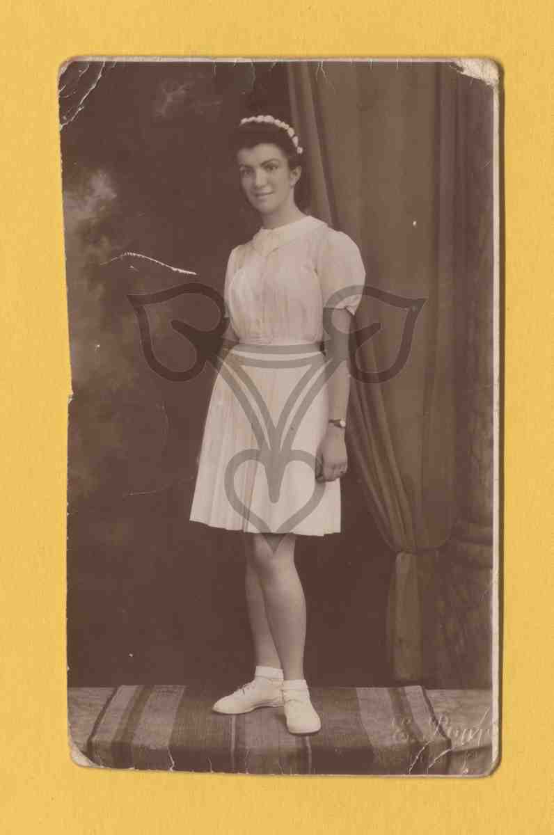 Studioaufnahme, gemalter Hintergrund. Junge Frau in weißem Kleid steht auf einem Teppich. In der rechten unteren Ecke nicht entzifferbare Prägestempel des Fotografen.