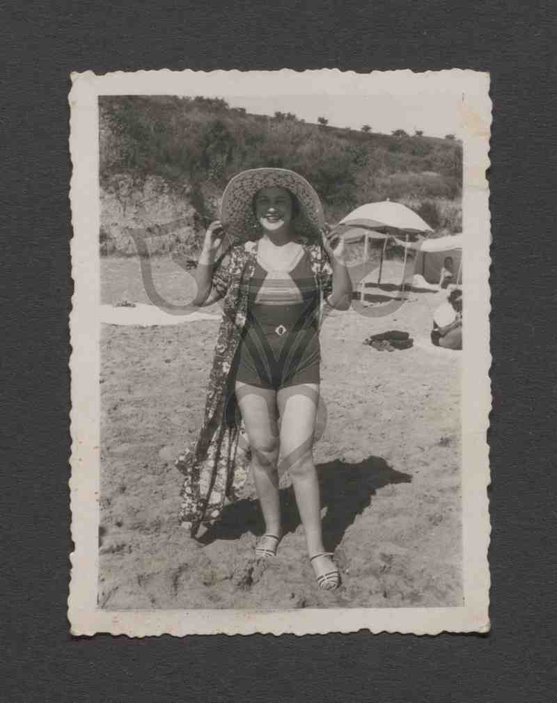 Die aufrecht stehende Frau trägt einen einteiligen Badeanzug, darüber ein aufgeknöpften bunt gemustertes Strandkleid, hält ihren Strohhut mit breiter Krempe mit beiden Händen fest und blickt in die Kamera. Im Hintergrund unter Sonnenschirmen und einem Zelt weitere Personen, dahinter ein mit Sträuchern bewachsener, teils steil abfallender Hügel.