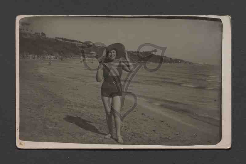 Die Frau trägt Badekleidung und einen breiten Strohhut, den sie mit beiden Händen auf dem Kopf festhält. Im Hintergrund rechts der Uferstrand Constanțas mit dem auf dem Carmen-Sylva-Hügel liegenden alten Casino.