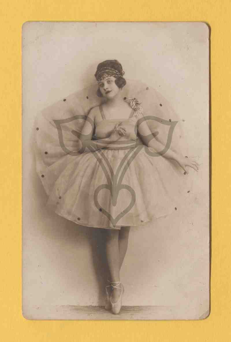 Studioaufnahme, neutraler Hintergrund. Die Frau, bekleidet mit einem hellen und am Saum gepunkteten Ballettkostüm und Ballettschuhen, steht mit dem Rücken gegen die Wand gelehnt auf Fußspitzen und hat den hinteren Teil des Rocke halbkreisförmig nach oben an die Wand gelehnt. Der Kopf ist leicht nach links unten geneigt und sie blickt in die Kamera.