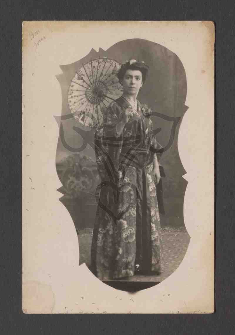 Studioaufnahme, gemalter Hintergrund. Die junge Frau trägt ein asiatisch anmutendes Kostüm, ist nach rechts gewandt und blickt an der Kamera vorbei.