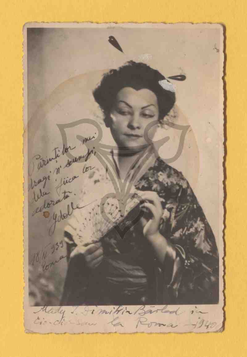 Studioaufnahme, gemalter Hintergrund. Die junge Frau trägt ein asiatisch anmutendes Kostüm, ist nach rechts gewandt und blickt in die Kamera. Aufnahme vermutlich in Theaterkulissen.