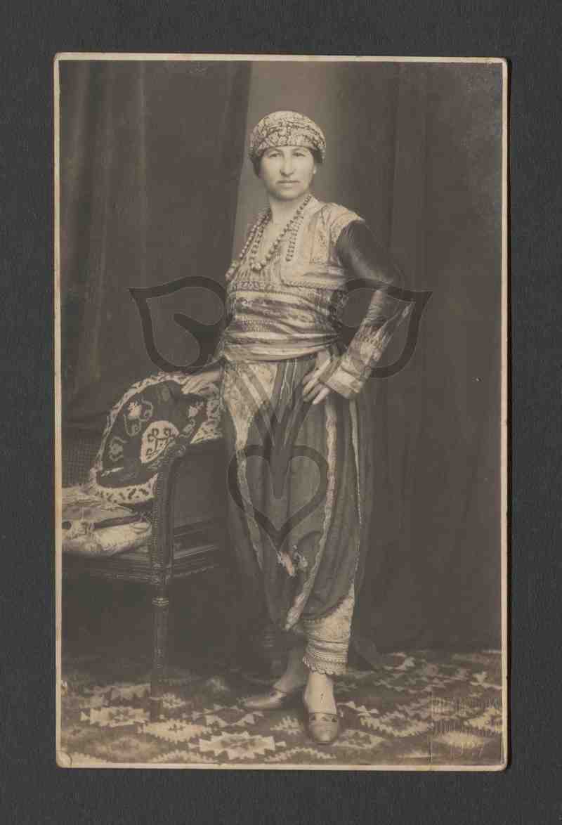 Die Tracht tragenden Frau steht aufrecht nach links gewandt, stützt sich auf der Lehne eines Stuhles ab und blickt in die Kamera.