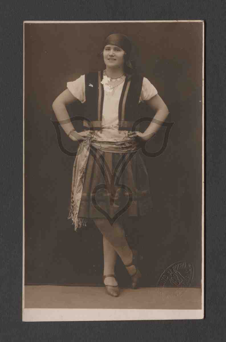 Studioaufnahme, neutraler Hintergrund. Die junge Frau steht aufrecht da und blickt in die Kamera. In der unteren rechten Ecke der Prägestempel des Fotografen.