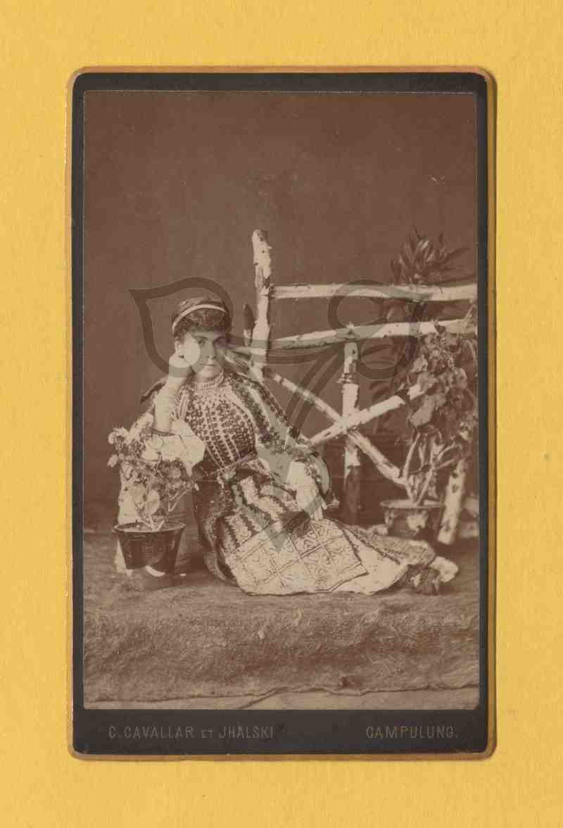 Studioaufnahme, neutraler Hintergrund. Die Tracht tragende Frau sitzt vor einer hölzernen Zaunattrappe auf dem Boden, stützt den Oberkörper auf einem runden Holzscheit ab und blickt rechts an der Kamera vorbei. Links und rechts von ihr stehen Blumentöpfe.