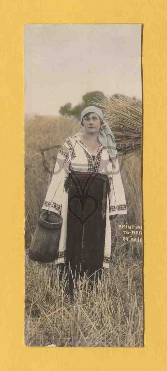 Die Tracht tragende Frau steht auf einem Feld, hält einen Holzhumpen in der Hand und blickt in die Kamera. Beschriftung: Amintiri … TG-Nea[mț] 24 iulie …
