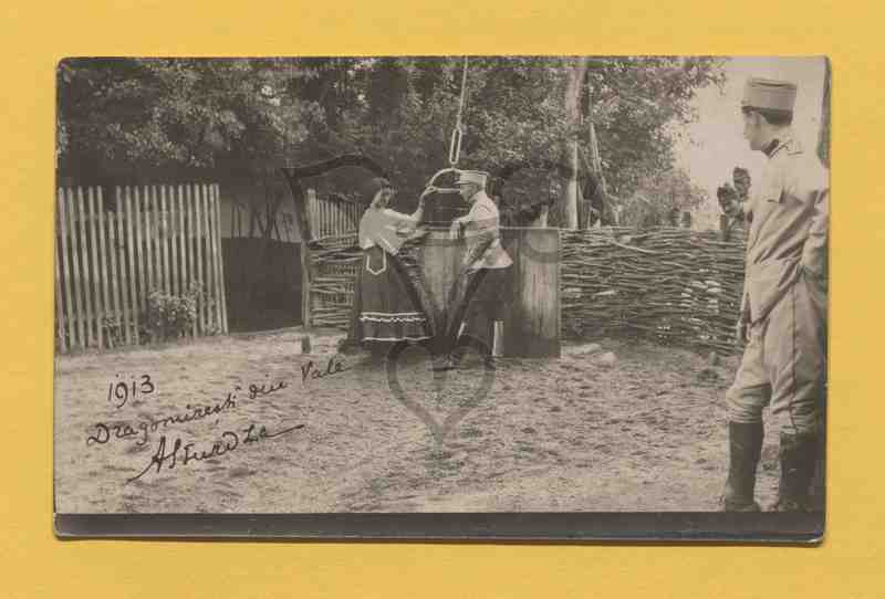 Vor einem Ziehbrunnen mit hölzerner Verkleidung steht eine junge Frau in Tracht. Rechts neben ihr steht ein Soldat lässig an die Brunnenverkleidung gelehnt. In der rechten Bildhälfte hinter dem Brunnen ist ein geflochtener Weidezaun, hinter dem mehrere Soldaten zu erkennen sind, ebenso am rechten Bildrand. Alle tragen sie die rumänische Uniform (Modell 1912). In der linken Bildhälfte sind im hinter einem Holzzaun aus hohen senkrechten Latten ein Gebäudes sowie dicht beieinander stehende Bäume zu erkennen.