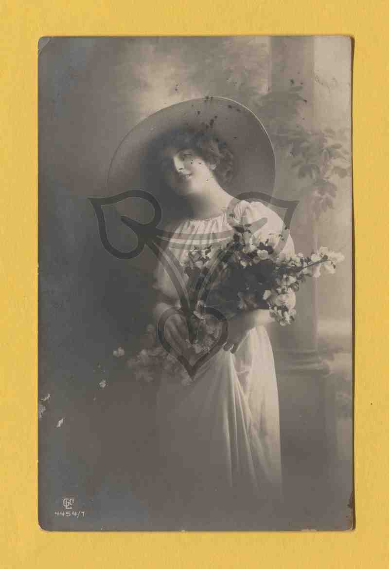 Studioaufnahme, gemalter Hintergrund. Die Frau steht aufrecht nach links gewandt und blickt in die Kamera. Sie trägt ein weißes Kleid und einen überdimensionalen weißen Hut. In den Händen hält sie einen Blumenstrauß mit weißen Blüten.