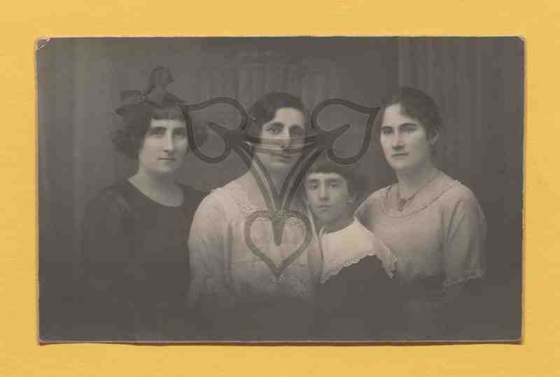 Studioaufnahme, gemalter Hintergrund. Halbbrustporträt von vier Frauen unterschiedlichsten Alters.