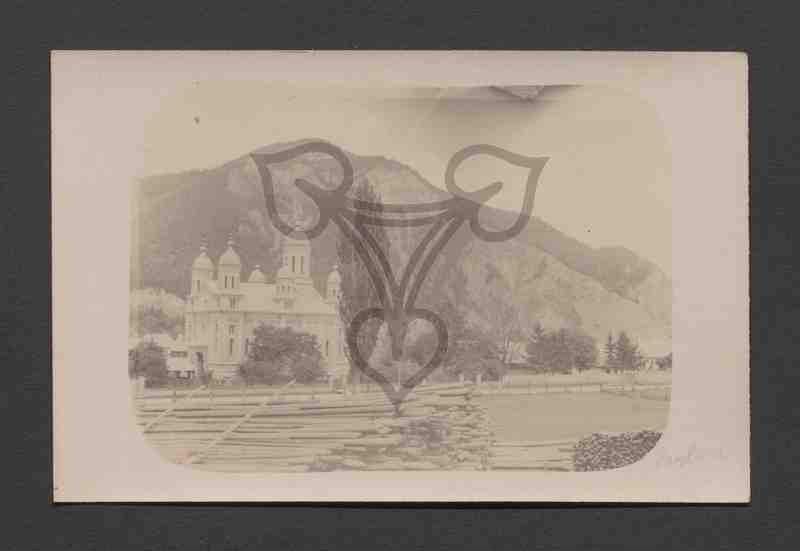 Außenansicht der orthodoxen Kirche. Im Hintergrund ein teils bewaldeter Felshügel, im Vordergrund gefällte Baumstämme.
