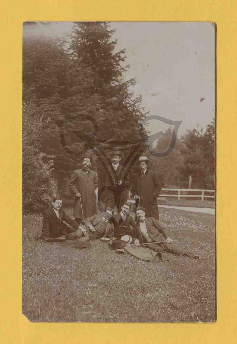 Sieben Männer, drei stehend, drei im Gras sitzend, sind im Freien auf einer Wiese nebeneinander gruppiert und blicken in die Kamera. Im Hintergrund links Bäume, rechts ein Weg, ein Holzzaun, dahinter Bäume.