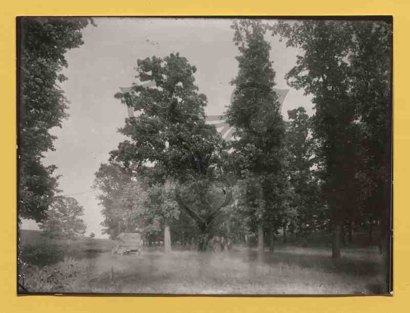 Auf der Lichtung eines Waldes steht eine Gruppe Männer. Links von ihnen befindet sich ein Auto.