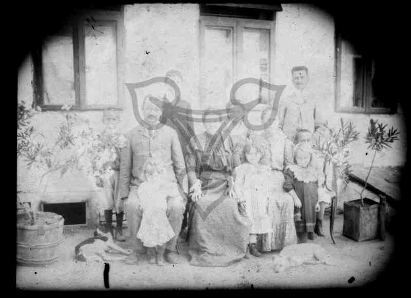 Vor einem Gebäude mit weißer Hauswand ist mehreren Reihen eine überwiegend sitzende Personengruppe abgebildet, die aus vier Erwachsenen und acht Kindern besteht. Ein Hund liegt in der linken unteren Ecke auf dem Boden, ein weiterer zu Füßen der Kinder in der rechten unteren Ecke. Vgl. auch PB 207/168.