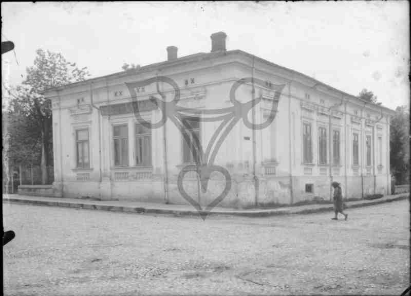 Eckansicht eines unbekannten eingeschossigen Gebäudes an der Kreuzung zweier Straßen. Eine Frau in Mantel oder Arbeitskittel und Kopftuch überquert die rechte Straße.