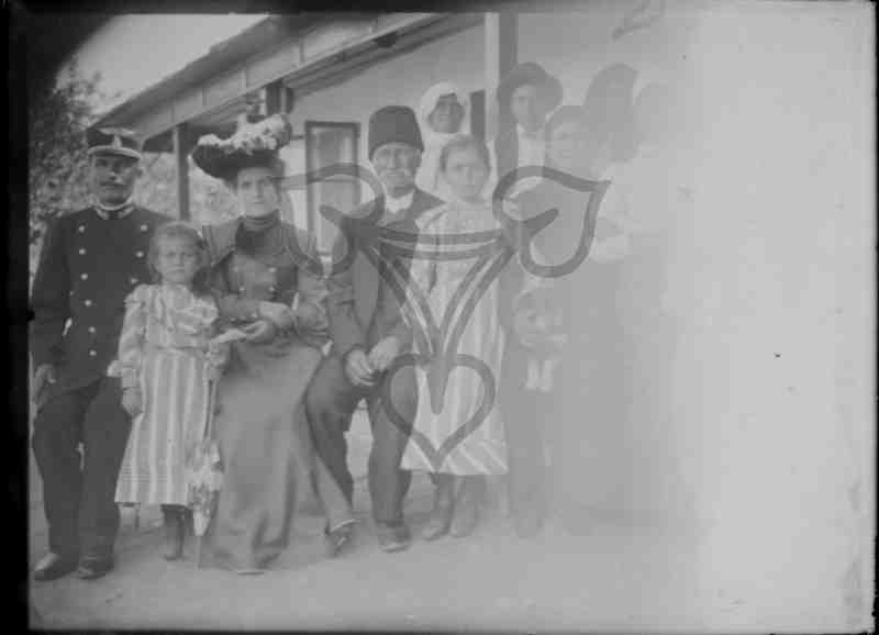 Vor der Veranda eines Hauses mit hell gestrichenen Wänden ist eine Personengruppe beiderlei Geschlechts und unterschiedlichsten Alters abgebildet. Zu erkennen ist ein Uniformträger, rechts daneben eine Frau, neben dieser ein älterer Mann, neben diesem rechts eine ältere Frau in schwarz, sowie ansatzweise ein jüngere Frau in weißer Bluse und dunklem Rock. Zwischen dem Uniformträger ganz links und der Frau an seiner Seite steht ein Mädchen, ein weiteres zwischen dem älteren Mann und der älteren Frau. Hinter diesen stehen zwei weitere Frauen und zwischen ihnen ein Mann.