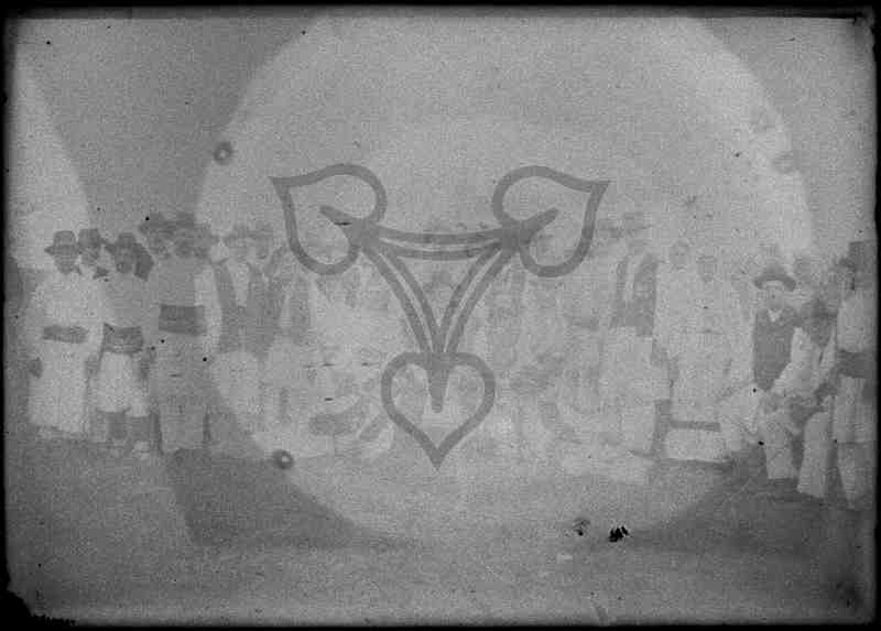 Halbkreisförmig aufgestellte Personengruppe in rumänischer Tracht. Glasplatte stark überbelichtet.