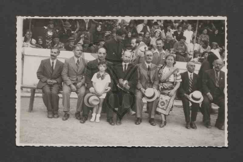 Auf einer Bank im Freien sitzen nebeneinander mehrere Männer in Anzügen. Bildmittig rechts wird die Männerreihe von einer Tracht tragenden Frau unterbrochen. Bildmittig links steht ein Junge zwischen den Beinen des dritten Mannes von links. Eine weitere Reihe Männer steht hinter den Sitzenden. Im Hintergrund eine Absperrung, dahinter mehrere mit Personen gefüllten Sitzreihen.